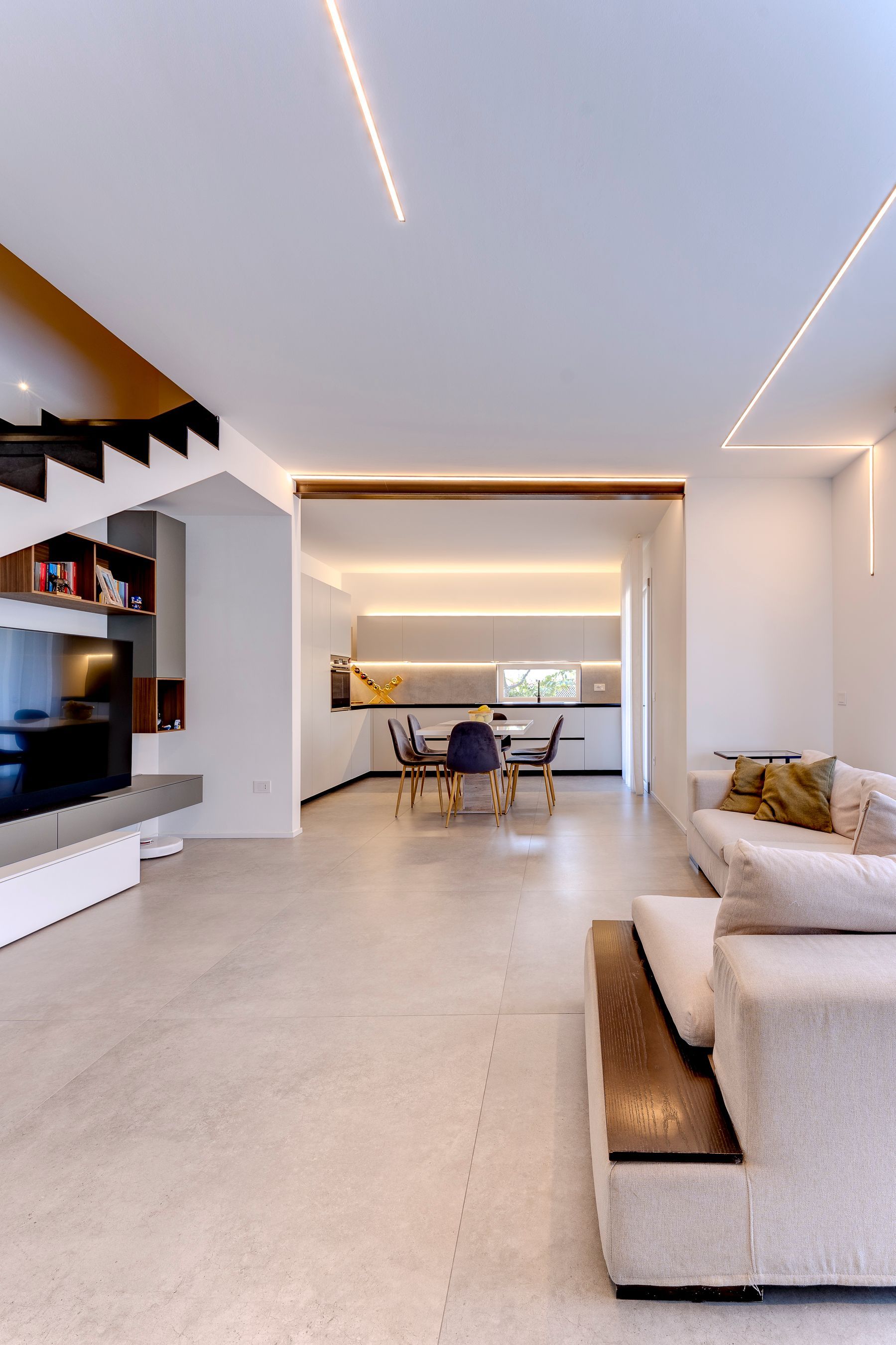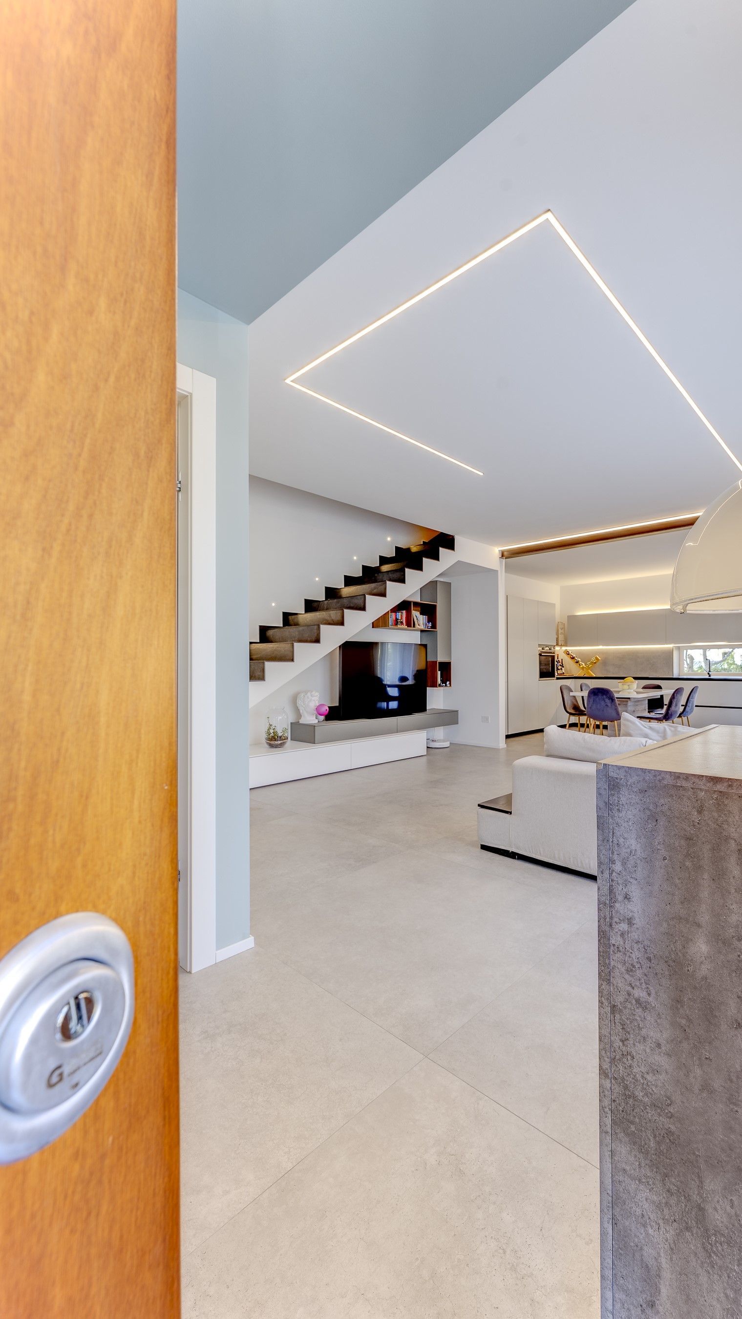 La cura dei dettagli e la sperimentazione nella struttura hanno reso possibile l'integrazione di una finestra ad angolo nella zona giorno, progettata in sinergia con la camera sovrastante al primo piano tramite una struttura autoportante, garantendo così una continuità visiva tra gli spazi esterni e interni. In contrasto con le linee decise dell'edificio, spicca una scala a chiocciola che si snoda a spirale dal piano interrato al primo piano attorno a un nucleo centrale.