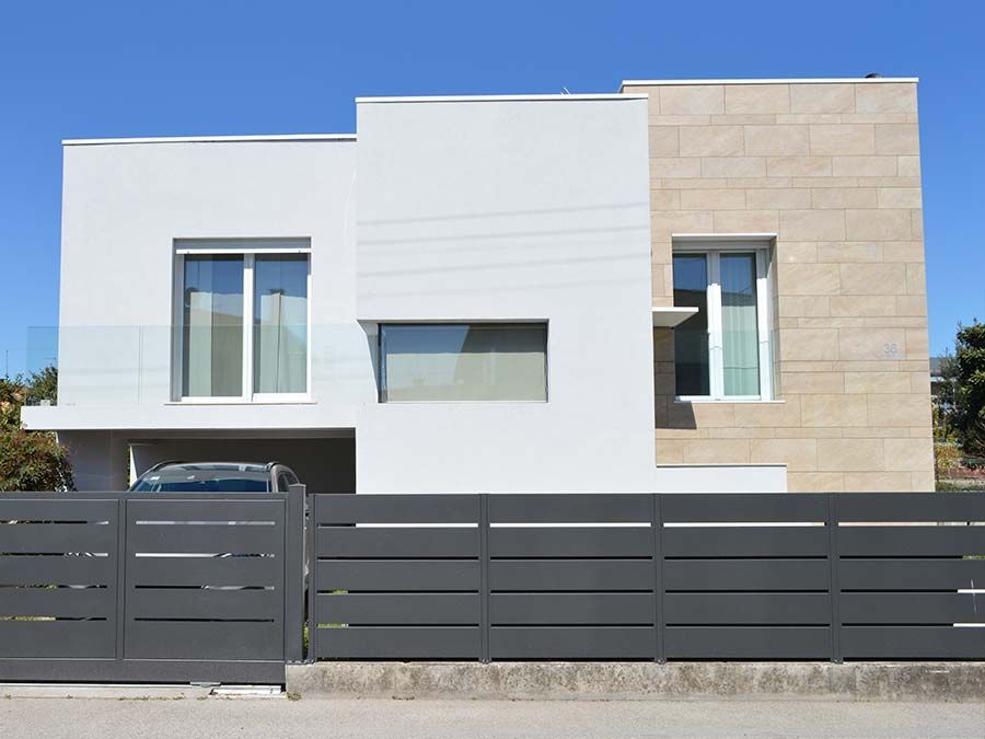 La cura dei dettagli e la sperimentazione nella struttura hanno reso possibile l'integrazione di una finestra ad angolo nella zona giorno, progettata in sinergia con la camera sovrastante al primo piano tramite una struttura autoportante, garantendo così una continuità visiva tra gli spazi esterni e interni. In contrasto con le linee decise dell'edificio, spicca una scala a chiocciola che si snoda a spirale dal piano interrato al primo piano attorno a un nucleo centrale.